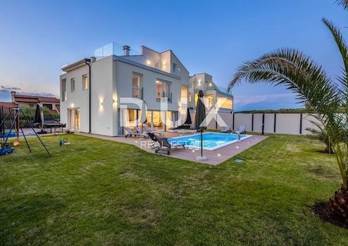 Wir bieten eine Luxusimmobilie an. Diese Luxusvilla liegt nur wenige Autominuten vom Zentrum von Poreč entfernt. Es hat eine Fläche von 265 m2 und wurde auf einem Grundstück von 800 m2 gebaut. Es erstreckt sich über drei Etagen und besteht aus einer Eingangshalle, einer Küche mit Esszimmer und einem Wohnzimmer mit offenem Raumkonzept. Vom Wohnzimmer aus besteht durch große Schiebewände eine Verbindung zum Garten, wo sich ein beheizter Pool von 26 m2 mit Massagepumpen und einem Wasserfall befindet. Es gibt auch eine Sauna und einen Whirlpool. Für die Kleinsten haben die Eigentümer einen Kinderspielplatz und ein Trampolin eingerichtet. Im Erdgeschoss gibt es außerdem ein Schlafzimmer mit eigenem Bad, Gäste-WC und Abstellraum. Wir steigen die Innentreppe in den ersten Stock hinauf, wo sich 4 Schlafzimmer, zwei Badezimmer und zwei Terrassen befinden, während sich im zweiten Stock zwei große Terrassen mit Blick auf das Meer in der Ferne und ein Schlafzimmer mit eigenem Bad befinden. Das ganze Haus verfügt über eine Fußbodenzentralheizung, die Kühlung erfolgt mittels Wärmepumpen und Fan Coils. Im Wohnzimmer gibt es als zusätzliche Heizquelle auch einen Holzkamin. Im Garten gibt es einen Heizraum mit Abstellraum und ausreichend Parkplätze für 6 Autos. Das Haus ist komplett möbliert und kategorisiert und eignet sich ideal als Investition für touristische Zwecke. Für weitere Informationen und zur Vereinbarung eines Besichtigungstermins rufen Sie den Makler an.