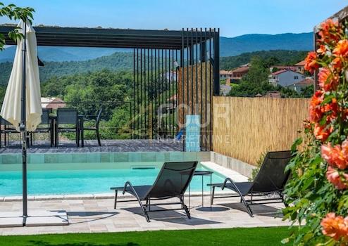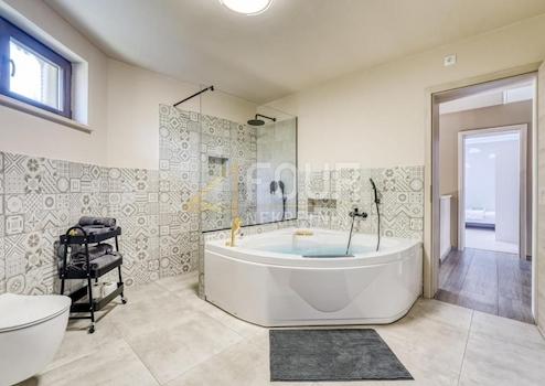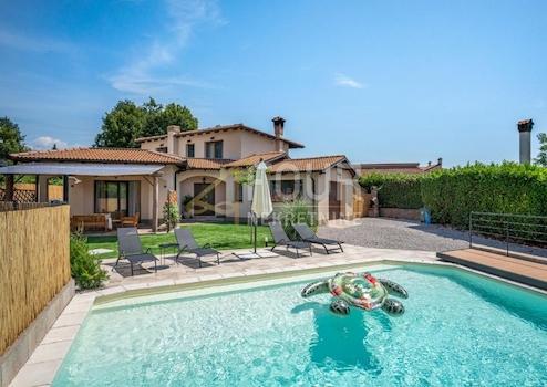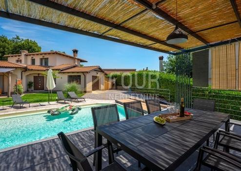 Der Außenbereich bietet alles, was Sie zum Entspannen und Genießen brauchen: einen 35m2 großen Swimmingpool mit Außendusche, eine Liegewiese, einen Pavillon, der sich ideal zum geselligen Beisammensein eignet, und einen Kinderspielplatz mit Trampolin, Minifußball und Badminton.