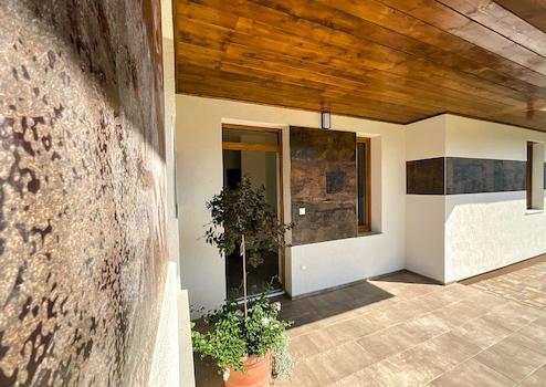 A nagy, fedett teraszra a bejáraton kívül a nappali nagy, elhúzható, üveges teraszajtaján is ki lehet jutni, így az nyári időszakban az élettér szerves része lehet.