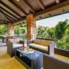 Der von hohen Steinmauern umgebene Innenhof bietet Privatsphäre und Intimität und enthält eine überdachte Sommerküche, einen wunderschön angelegten Garten mit mediterranen Pflanzen, ein Sonnendeck, einen runden Pool, einen Whirlpool für sechs Personen und eine Tischtennisplatte. Die Villa ist alarm- und videoüberwacht.