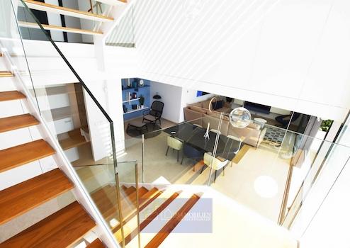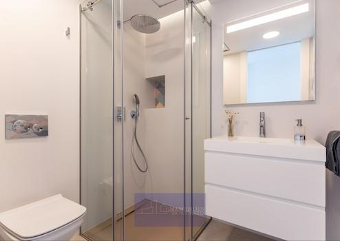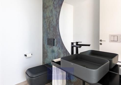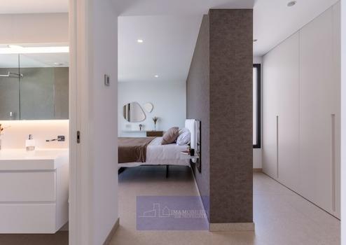 Von hier aus führen eine Treppe und der private Lift zu den anderen Stockwerken und zum Carport für zwei Fahrzeuge. In der mittleren Etage liegen drei Schlafzimmer, von denen sich zwei – je mit Bad en Suite und einem großen Kleiderschrank - eine Terrasse teilen. Das Hauptschlafzimmer hat einen großen Ankleideraum, ein eigenes Bad mit Badewanne, in der man sich maximal entspannen kann und eine private Terrasse. Das Bett steht hier so, dass man schon beim Aufwachen den Ausblick auf das Meer genießen kann.