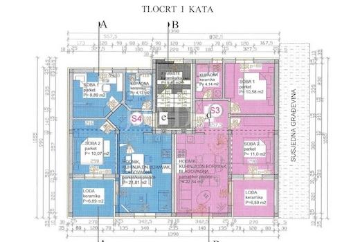 Im Erdgeschoss (Höhe des ersten Stocks) befinden sich zwei Wohnungen, beide mit zwei Schlafzimmern, einem Badezimmer und einem offenen Wohnzimmer und einer Küche mit Zugang zu einer schönen Loggia.