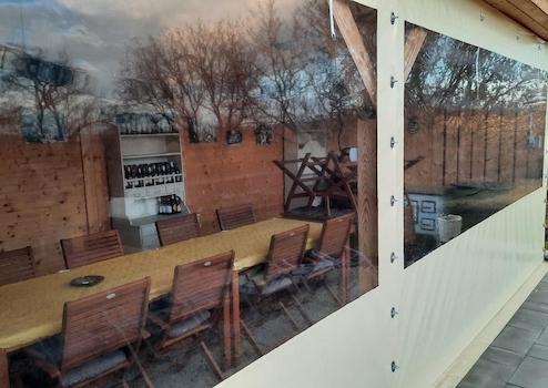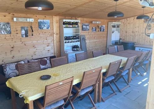 In Fortsetzung der Bebauung wurde eine überdachte Terrasse von ca. 30 m2 errichtet, dreiseitig geschlossen, einseitig mit einer Plane verschlossen und beheizt. Vor dem Haus gibt es einen Ziergarten und hinter den Häusern einige Obstbäume. Aufgrund der Grundstücksgröße ist es auch ideal für die Haltung von Tieren, z.B. Pferden.