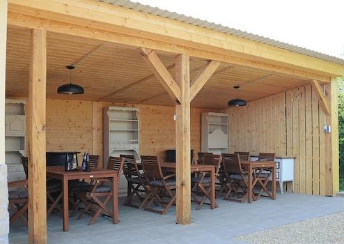 Mit Holzschuppen und einem modernen, belebten Gemeinschaftsbereich sowie einer Sommerküche.