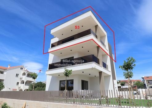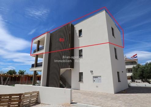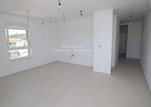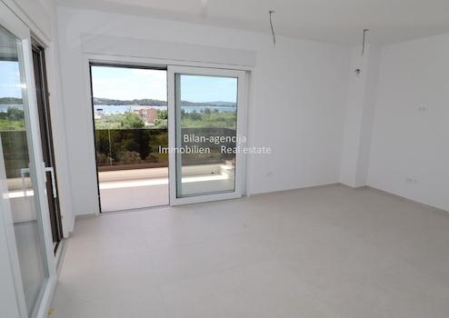Die Wohnung befindet sich in Vodice, im zweiten Stock eines neuen Gebäudes. Es besteht aus 3 Schlafzimmern, 2 Bädern, Wohnküche, Flur und Terrasse mit direktem Blick auf das Meer. Die Wohnung verfügt über einen Kellerabstellraum von 9,61 m2 und 2 Parkplätze im umzäunten Hof.