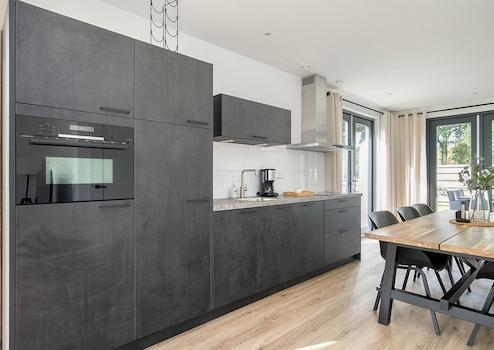 Die optionale, luxuriöse offene Küche ist u.a. mit Kühl-Gefrierkombination, Induktionskochfeld, Kombi-Backofen/Mikrowelle und Geschirrspüler ausgestattet.