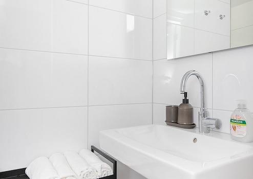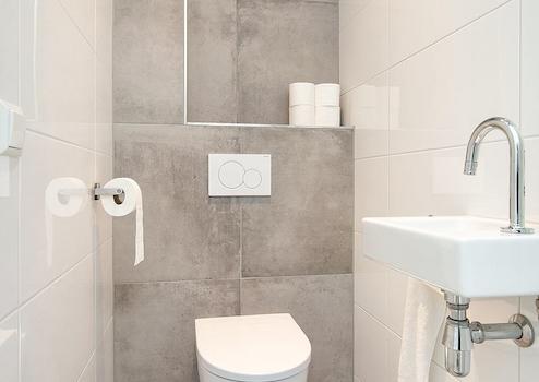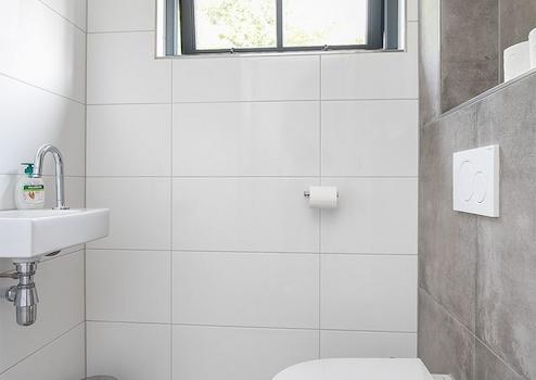 Auf dem Treppenabsatz befindet sich das zweite Badezimmer, das mit einer begehbaren Dusche und einem Waschbecken ausgestattet ist.