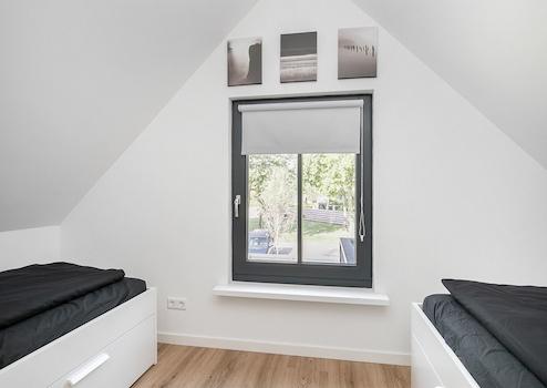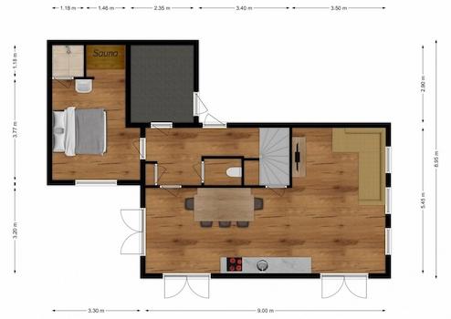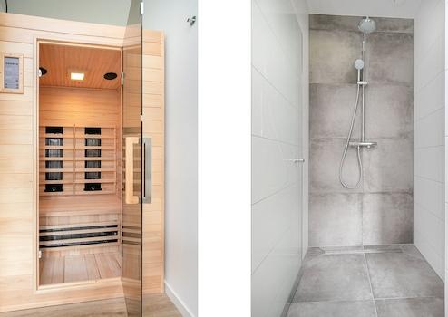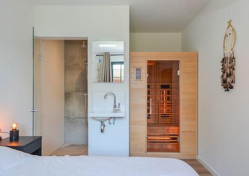Im Erdgeschoss befindet sich ein geräumiges Schlafzimmer mit einem angrenzenden Badezimmer.Dieses Badezimmer ist mit einer begehbaren Dusche und einem Waschbecken ausgestattet und bietet die Möglichkeit, eine Infrarotsauna einzubauen.