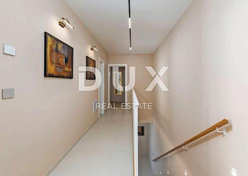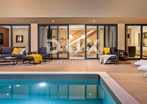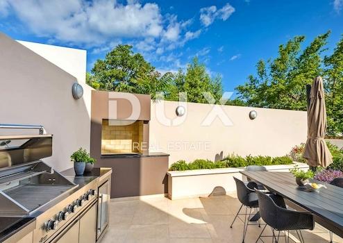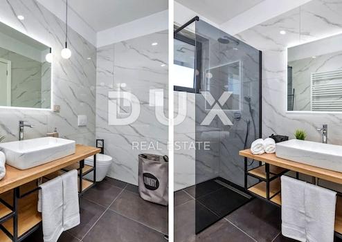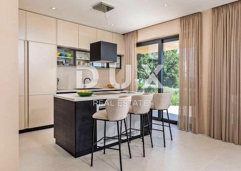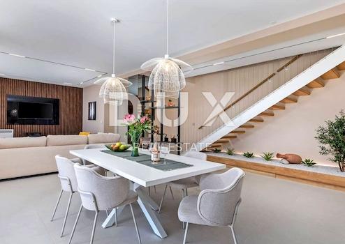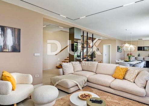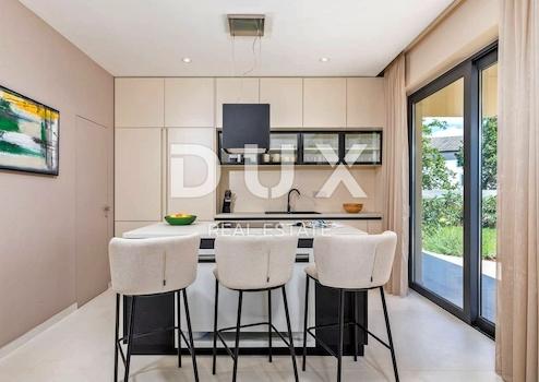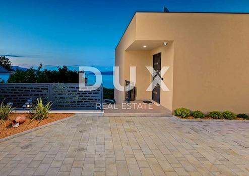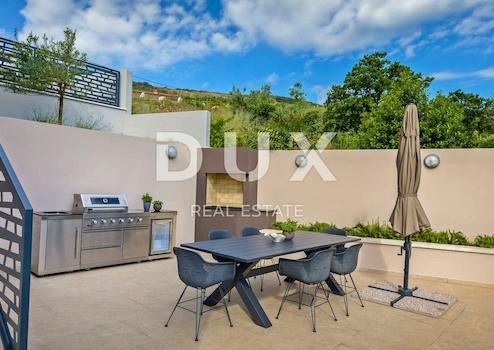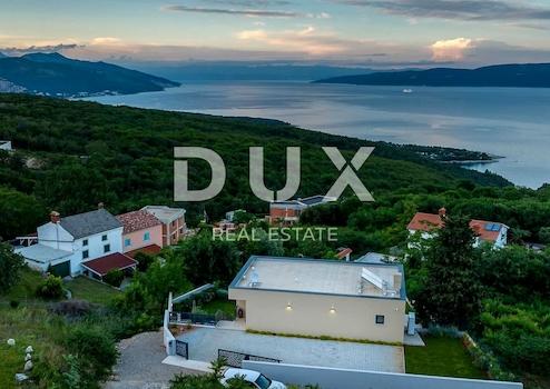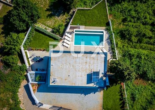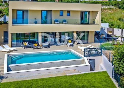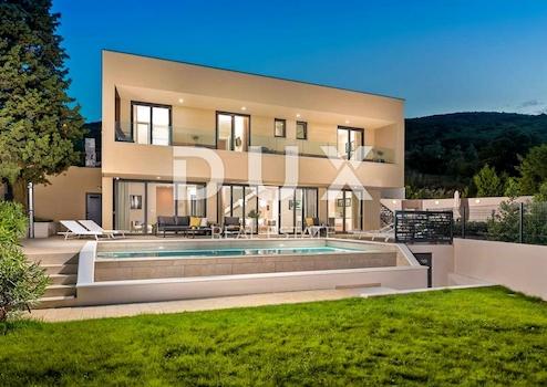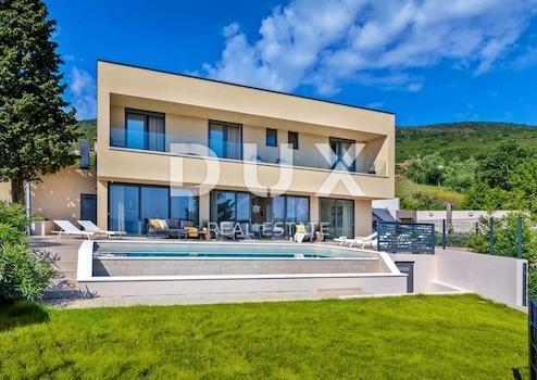 An der Südostküste Istriens, wo grüne Hügel auf das Meer treffen, wo Natur und Erbe zusammenkommen, gibt es zwei Städte ähnlicher Größe, aber mit unterschiedlichem, sich aber gegenseitig ergänzendem Charakter – Labin und Rabac, nur fünf Kilometer voneinander entfernt. Rabac wird wegen seiner weißen Kiesstrände, der üppigen mediterranen Vegetation und dem kristallklaren Meer auch die Perle der Kvarner-Bucht genannt. Einst ein kleines Fischerdorf, ist Rabac heute ein attraktives Touristenziel, das in einem Netz farbenfroher Straßen eine Fülle kultureller Veranstaltungen verbirgt. Die grüne Umgebung von Rabac und das malerische Hinterland laden das ganze Jahr über zu Abenteuern, Forschung und Erholung ein. Unweit von Rabac und Labin, in einer kleinen Siedlung am Meer, steht ein Neubau mit Panoramablick auf das Meer zum Verkauf. Es befindet sich in einer ruhigen Gegend mit einer Aussicht, die Učka, die Stadt Rijeka, die Kvarner-Inseln und die kristallklare Adria umfasst, und die Lage dieser Immobilie bietet genau diese bezaubernde und einzigartige Aussicht. Es zeichnet sich durch ein modernes Design aus und bei seiner Konstruktion wurden hochwertige Baumaterialien gemäß den höchsten Standards für den Wohnungsbau verwendet. Der Entwurf basierte auf der kaskadenartigen Gestaltung des Geländes, wodurch es teilweise im Gelände versunken ist, auf der Ausrichtung auf den Blick auf das blaue Meer und die bezaubernde Landschaft, von der es umgeben ist, und auf dem Zusammenspiel von Außen- und Innenbereich. Das Innenkonzept eines funktionalen Grundrisses über zwei Etagen basiert auf Praktikabilität, offenem Grundriss und Luftigkeit. Es zeichnet sich durch zahlreiche Glaswände, hochwertige Ausstattung und sorgfältig ausgewählte Elemente moderner Möbel aus und schafft ein elegantes und ästhetisch ansprechendes Ambiente voller Komfort. Die untere Etage des Hauses öffnet sich mit Glaswänden zum Außenbereich und zum Pool. Es besteht aus einem offenen Raum, der Wohnzimmer, Esszimmer und Küche mit Zugang zur überdachten Terrasse, Gästetoilette, Speisekammer und Waschküche vereint. Ergänzt wird der Grundriss durch einen Geräte-/Lagerraum mit separatem Außenzugang. Der Haupteingang zum Haus befindet sich im Obergeschoss. Die Etage besteht aus drei Schlafzimmern mit eigenem Bad und Ausgang zu einer geräumigen Terrasse. Auf der Ebene mit dem Obergeschoss bietet eine sorgfältig gestaltete und sorgfältig angelegte Auffahrt Parkplätze sowie Zugang über eine Außentreppe zum Untergeschoss und zum Innenhof, der mit einem Überlaufpool und einer Sommerküche geschmückt ist. Der Hof ist eingezäunt, minimalistisch mit Gras und einheimischen Pflanzen dekoriert und bietet Privatsphäre und Ruhe. Diese perfekt integrierte Immobilie ist eine außergewöhnliche Gelegenheit für ein komfortables Familienleben sowie eine Investitionsinvestition in das touristische Vermietungsgeschäft.
