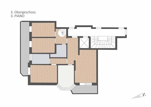 RAUMAUFTEILUNG 3. OG: Eingangsbereich, großzügiges Wohnzimmer mit Kaminofen und Westterrasse, separate Wohnküche, Elternzimmer mit Terrasse, 2 Zimmer, umwandelbar in Wohn-Kochbereich mit 2 Terrassenzugängen, 2x Bad mit Fenster, Wendeltreppe, großzügiger, bewohnbarer Dachbereich, abtrennbarer Flurbereich, 2 großzügige Terrassen