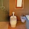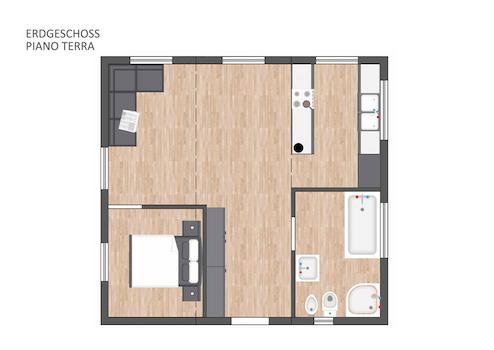 RAUMAUFTEILUNG: Eingangs-Wohn-Kochbereich mit Holzofen, 1 Schlafzimmer, großes Bad mit Fenster (8m²),