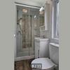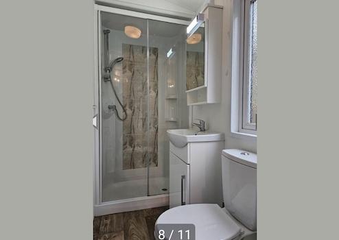 Badezimmer mit Dusche, Toilette, Waschbecken und Belüftungssystem