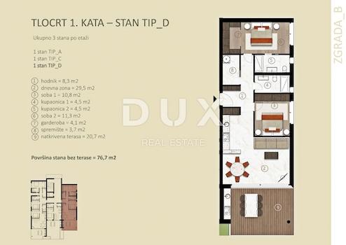 Novigrad, einst ein friedliches Fischerdorf, hat sich im Laufe der Jahre zu einem attraktiven Reiseziel für Touristen aus ganz Europa und der Welt entwickelt, von denen viele regelmäßig zurückkehren. Novigrad hat sich zu einem der begehrtesten Orte für touristische Aufenthalte und Ferien entwickelt und hat seinen unwiderstehlichen Charme eines ruhigen Fischerortes und die erkennbare, fast intime Atmosphäre bewahrt, die für kleine Städte am Mittelmeer so charakteristisch ist. Novigrad, eine kleine Stadt am Mittelmeer, ist eine architektonische Perle voller historischer Sehenswürdigkeiten, reichem Kulturerbe, erhaltener Naturschönheiten, aber auch hervorragender gastronomischer Köstlichkeiten und anderer Attribute. Die Riviera von Novigrad an der Westküste Istriens erstreckt sich von Dajla bis zur Mündung des Flusses Mirna und ist mit einer gegliederten, niedrigen und zugänglichen Küste aus Fels- und Kiesstränden geschmückt. Im Wohnviertel von Novigrad, in der Nähe des Meeres und aller kommerziellen, kulturellen, Bildungs- und Freizeiteinrichtungen, entsteht ein Gebäude in modernem Design, das sich über das Erdgeschoss und zwei Etagen erstreckt und insgesamt 8 Wohneinheiten enthält. Bei der Konstruktion werden langlebige und zuverlässige Materialien verwendet, die langfristige Zufriedenheit und Sicherheit des Wohnens garantieren, während die Raumplanung jeder Etage detailliert durchgeführt wurde, was zu einer hochwertigen Raumaufteilung führte. Die Kombination aus Ästhetik, Funktionalität und Komfort ist das Ziel, mit dem alle Wohnungen gestaltet werden. Der zeitgenössische Stil orientiert sich an den neuesten Trends in der Inneneinrichtung, wobei der Schwerpunkt auf dezenten und unaufdringlichen Details liegt, die mit warmen Naturtönen verfeinert werden. Die Kombination aus traditionellen Materialien und zeitgenössischem Design hinterlässt einen Eindruck von Luxus, der durch Details wie erstklassiges Eichenparkett, erstklassige großformatige Keramikfliesen und hochwertige Sanitäranlagen namhafter Hersteller hervorgehoben wird. Ein solches Interieur mit natürlicher Textur und warmen Farbtönen strahlt unaufdringlich Behaglichkeit aus, während hohe Decken und klare, gerade Linien mit großen verglasten Wänden die Geräumigkeit zusätzlich betonen. Beim Verkaufsgegenstand handelt es sich um eine Wohnung im ersten Stock des Gebäudes. Die Nettoquadratfläche mit berechneten Koeffizienten beträgt 93,45 m², während die Bruttoquadratfläche 115,1 m² beträgt und eine Wohnfläche von 76,7 m², eine überdachte Terrasse von 20,7 m² und einen Lagerraum im Erdgeschoss des Gebäudes von 5,2 m² umfasst und ein überdachter Parkplatz von 12,5 m². Die Wohnung besteht aus zwei Schlafzimmern, zwei Badezimmern, einem Flur, einem Abstellraum und einem offenen Raum, der Wohnzimmer, Esszimmer und Küche mit Zugang zur Terrasse vereint. Dieses luxuriöse neue Gebäude ist eine ideale Gelegenheit für ein komfortables Familienleben sowie eine Investition zur touristischen Vermietung. Der geplante Termin für die Fertigstellung der Arbeiten ist für Mai 2025 vorgesehen. Der angegebene Preis der Immobilie bezieht sich auf die Endausführung ohne Möbel, die eine Enddekoration nach den eigenen Wünschen und Vorlieben ermöglicht. Der Verkäufer der betreffenden Immobilie ist eine juristische Person.