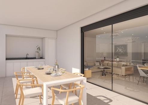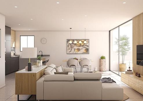 Die Wohnungen im Erdgeschoss verfügen über 3 Schlafzimmer und 2 Bäder, die übrigen Wohnungen über 2 Schlafzimmer und 2 Bäder. Die Wohnungen wurden in einem zeitgenössischen Stil und mit einem offenen Konzept entworfen, das aus einer Einbauküche und einem Wohn-/Essbereich besteht.