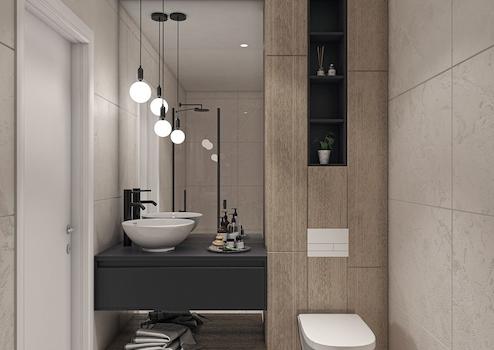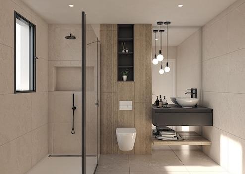- Komplett ausgestattete Bäder mit Waschtisch, Spiegel und Duschabtrennung