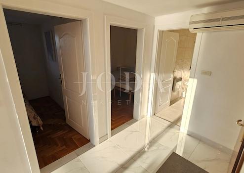 Zum Verkauf steht eine geräumige Wohnung von 83,50 m², die sich im 2. Stock eines Gebäudes in einer ruhigen und attraktiven Gegend, nur wenige Schritte vom Meer entfernt, befindet. Die Wohnung besteht aus einem Eingangsbereich mit einer Wendeltreppe, einem Wohnzimmer, einem Essbereich und einer Küche, zwei Schlafzimmern, einem Badezimmer und einer großen Terrasse von 61,53 m² mit wunderschönem Meerblick. Die Wendeltreppe führt in das hohe Dachgeschoss von 21,97 m², das eine Galerie, ein zusätzliches Zimmer, ein WC und einen Abstellraum umfasst.