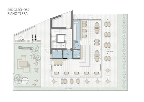 RAUMAUFTEILUNG: große Show-Küche mit Aufzug, vorgelagerter Tresen, rund 40 Sitzplätze im Innenbereich, weitere 36 auf der Sonnenterrasse, Vorraum, Damen-Herren-WC's, ebenerdiger Stauraum weiteres Magazin im Untergeschoß