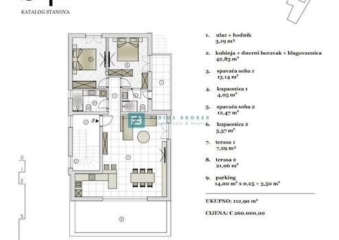 Die Wohnung S4 befindet sich im 2. Obergeschoss und erstreckt sich über die gesamte Etage mit einer Gesamtfläche von 112,90 m². Es besteht aus einem Eingang, einem Flur, zwei Schlafzimmern, von denen eines Zugang zu einer 7,29 m2 großen Terrasse hat, zwei Badezimmern, einer offenen Küche mit Esszimmer und einem Wohnzimmer mit Zugang zu einer geräumigen Terrasse von 21,06 m2. Durch eine kleine Aufteilung ist es möglich, ein drittes Schlafzimmer mit Fenster zu schaffen und so den Raum noch weiter an die Wohnbedürfnisse anzupassen. Zur Wohnung gehört 1 Parkplatz.