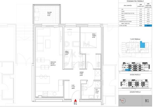 This two-bedroom apartment is located on the ground floor of a new residential building near the center of Zaprešić. The apartment features 61.72 m² of heated living space and a net usable area of 66.49 m², including a 6.36 m² balcony.