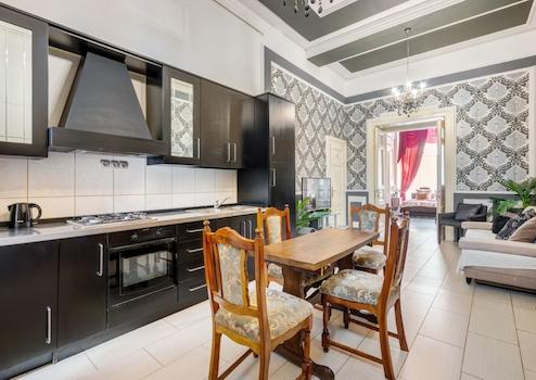In der Wohnung erwartet den zukünftigen Eigentümer ein modernes Badezimmer, in dem eine Eckbadewanne und eine große Duschkabine für Komfort sorgen. Die Innenräume des Anwesens werden durch elegante Möbel und Accessoires im bürgerlichen Stil, Holzstuck, italienische Designtapeten und Spiegel einzigartig gemacht. Die Zimmer sind hell, sonnig, geräumig und verbinden perfekt die Eleganz der Geschichte mit modernem Komfort.
