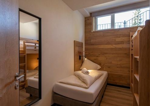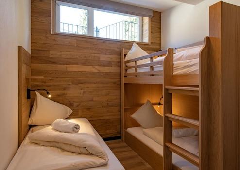 Das zweite Schlafzimmer verfügt über ein Etagenbett und ein zusätzliches Einzelbett.