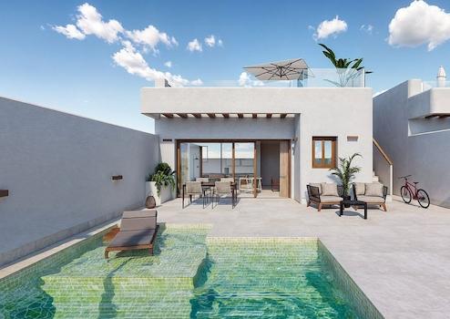 Die modernen, einstöckigen Villen verfügen über 2 oder 3 Schlafzimmer und 2 Badezimmer, eine offene Küche und einen geräumigen Wohn-/Essbereich. Die Immobilie wird höchsten Ansprüchen gerecht und ist mit einem privaten Swimmingpool mit Dusche, einer komplett möblierten und ausgestatteten Küche, einer Sommerküche auf der Sonnenterrasse, Beleuchtung, gefütterten Kleiderschränken, voll ausgestatteten Badezimmern, einer Vorinstallation für eine Klimaanlage mit Kanälen und einem Parkplatz auf dem Grundstück ausgestattet.
