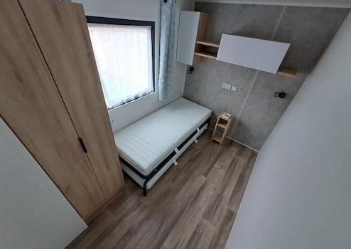 Auf der anderen Seite des Chalets gibt es zwei weitere Schlafzimmer, darunter dieses, das mit einem Klappbett ausgestattet ist, das unter das andere gestellt werden kann.