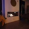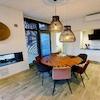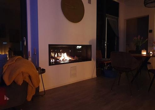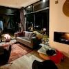 Schönes Wohnzimmer mit großen Fenstern mit Blick auf das Wasser. Wunderbarer Ort. Fantastisches Ambiente Kamin, die Sie von innen bewundern können und Verbot außerhalb. Das Wohnzimmer beherbergt auch die offene Küche.