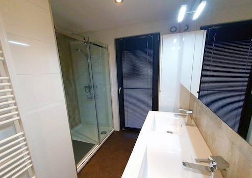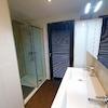 Das geräumige Badezimmer hat ein Doppelwaschbecken mit einem großen Spiegel darüber. Die Dusche kann auch als geräumig bezeichnet werden, mit einer Duschwand, die sich verschieben lässt. Das Badezimmer hat auch Schränke, um Ihre Sachen zu verstauen.