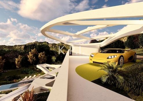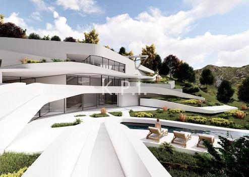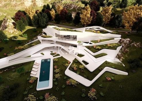 Die verführerischen Linien der organischen Architektur folgen der Topografie des Landes und lassen den Eindruck entstehen, dass die Architektur aus der Landschaft hervorgeht. Die gesamte Form des Gebäudes ist perfekt an die natürliche Form des Grundstücks angepasst, fügt sich in die Umgebung ein und schafft ein Maximum an Front und die wundervolle Aussicht.