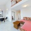 Das Erdgeschoss der Wohnung besteht aus zwei Schlafzimmern, einem Badezimmer, einem offenen Wohnbereich mit Küche und Esszimmer sowie einem Balkon mit herrlichem Panoramablick auf das Meer. Über eine Wendeltreppe im Inneren gelangt man in das Obergeschoss, wo sich ein weiteres Schlafzimmer, eine Toilette und ein praktischer kleiner Abstellraum befinden.