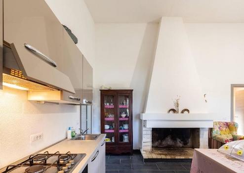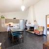 • Großes Wohnzimmer mit offener Küche und einem warmen Kamin aus Holz, ideal für entspannende Momente;