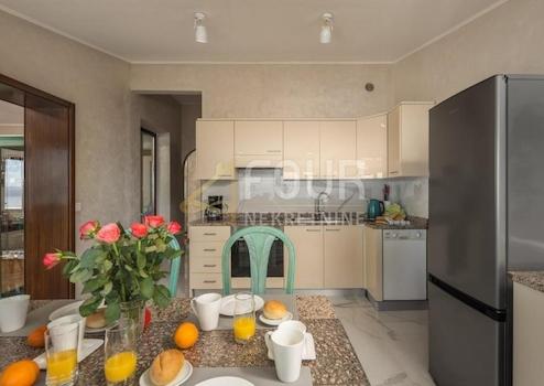 Die Wohnung erstreckt sich über 130 m² und besteht aus drei großzügigen Schlafzimmern, einem modern eingerichteten Wohnzimmer, zwei eleganten Badezimmern sowie einer Loggia mit Panoramablick auf das Meer.