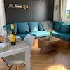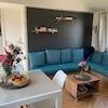 Gemütliches Wohnzimmer mit viel Lichteinfall von beiden Seiten. Zugang zur Veranda. Stilvoll und behaglich eingerichtet. Mit festem Ecksofa, Esstisch und Fischgrätenboden.