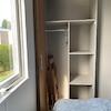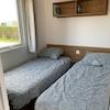 Schlafzimmer mit 2 Einzelbetten, Stehschrank und Hängeschrank.