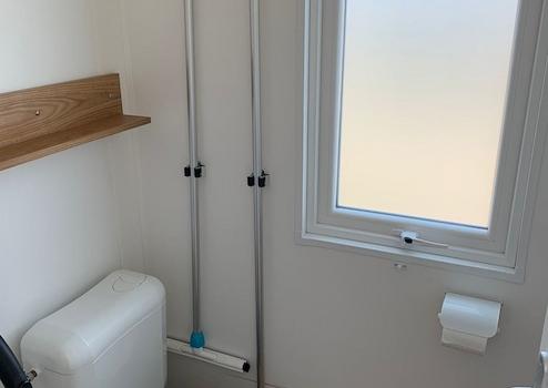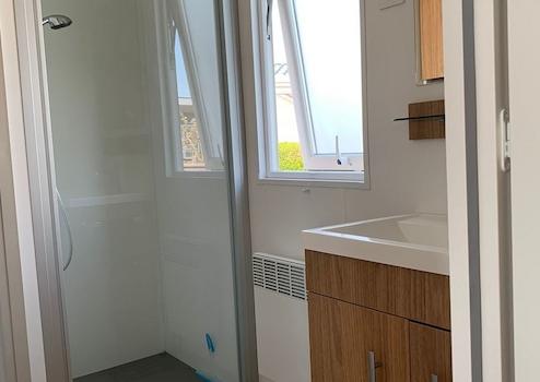 Das Badezimmer grenzt an das „Elternschlafzimmer“ und ist mit einer Dusche, einem Waschbecken und einem Waschtisch ausgestattet.