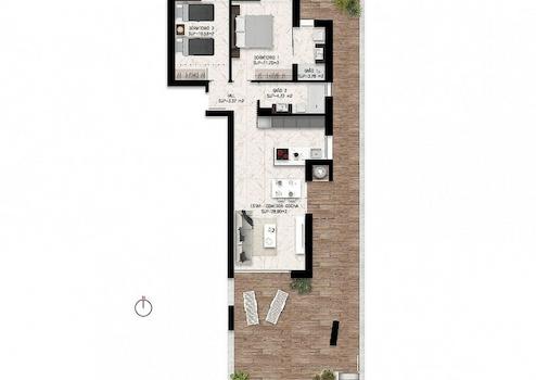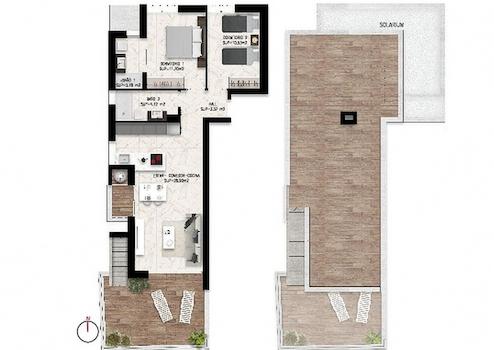 Die Anlage besteht aus Maisonette-Wohnungen mit zwei Schlafzimmern und zwei Bädern, entweder im Erdgeschoss mit Garten oder im Obergeschoss mit Dachterrasse.