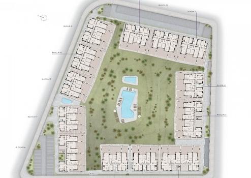 Diese neue Wohnanlage verfügt über einen großen zentralen Gemeinschaftsbereich mit einem angelegten Gartenbereich mit Swimmingpool und Entspannungsbereichen.