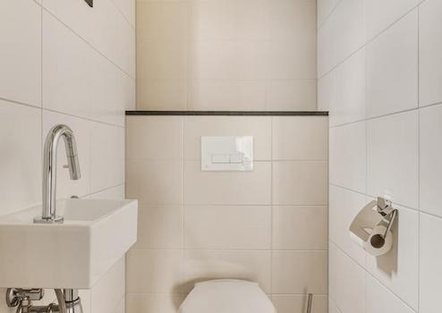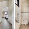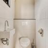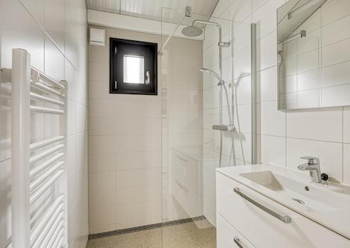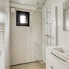 Das Badezimmer ist stilvoll und praktisch mit einem Waschbecken und einem passenden Waschtischunterschrank, ideal für die Aufbewahrung all Ihrer Sachen. Die Duschkabine bietet einen eleganten Look und macht den Raum bequem zu nutzen. Der Design-Heizkörper sorgt für ein warmes Handtuch nach dem Duschen, während das Fenster für natürliche Belüftung und Tageslicht sorgt.