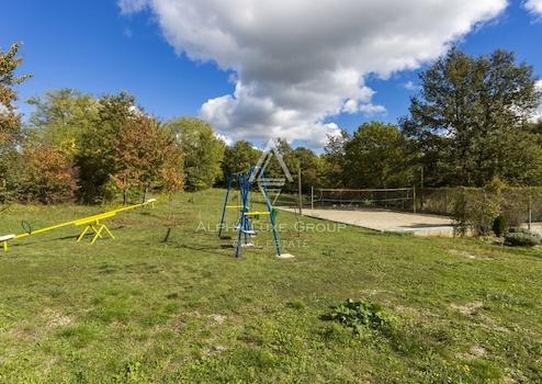 Das Anwesen bietet zudem einen Freizeitbereich mit einem Sand-Volleyballfeld, Schaukeln, Wippen, einem gemauerten Grill und einem kleinen Bauernhof. Es liegt am Ende einer ruhigen Sackgasse, umgeben von üppigem Grün und Wäldern, und bietet Privatsphäre und Ruhe.