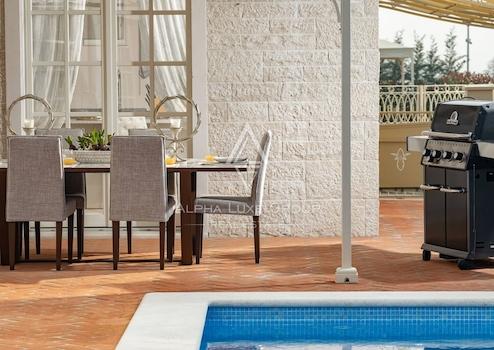 Diese elegante Immobilie verfügt über drei geräumige Schlafzimmer mit jeweils eigenem Bad für maximalen Komfort. Der Außenbereich umfasst einen privaten Pool mit 28 m², einen wunderschön angelegten mediterranen Garten und eine Essbereich-Terrasse, die perfekt für Familienfeiern und gesellige Abende ist. Das Interieur ist mit Kronleuchtern, luxuriösen Vorhängen und Design-Elementen exquisit gestaltet. Die Dachterrasse bietet atemberaubende Ausblicke, ideal für Sonnenuntergänge mit einem Glas istrischen Weins, während der Grillplatz das Angebot im Freien abrundet.