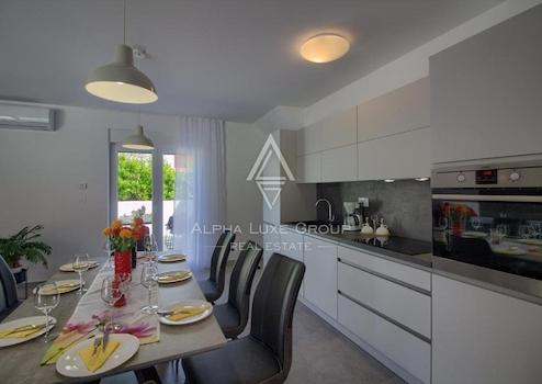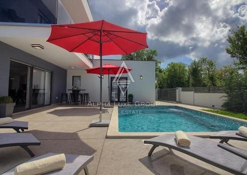 Diese elegante zweistöckige Ferienvilla in der Nähe von Pula steht nun zum Verkauf und bietet 145 m² modernen Wohnraum. Das Erdgeschoss umfasst eine voll ausgestattete Küche mit Speisekammer, einen Essbereich und ein geräumiges Wohnzimmer mit einer großen Glaswand, die zur Terrasse und zum Pooldeck führt. Auf dieser Ebene befindet sich auch ein Schlafzimmer mit eigenem Bad sowie ein zusätzliches Gäste-WC. Im Obergeschoss finden Sie zwei weitere Schlafzimmer, jedes mit eigenem Bad, und einen gemeinsamen Balkon mit herrlichem Blick auf die ruhige Umgebung. Die Villa ist mit einer Fußbodenheizung über eine Wärmepumpe ausgestattet und in jedem Raum klimatisiert. Der eingezäunte und angelegte Garten bietet gesicherten Parkplatz für drei Autos und ist um einen 29 m² großen Pool mit Sonnendeck angelegt, perfekt für die Sommerentspannung. Die ruhige Lage der Villa bietet einen idealen Rückzugsort vom Stadtleben.