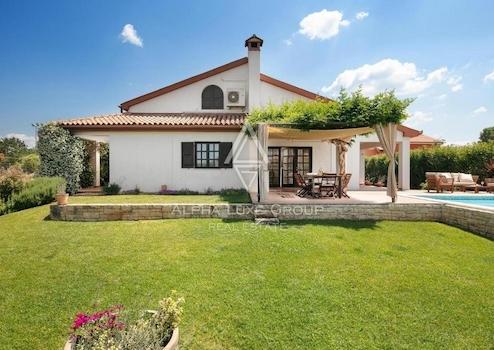 Der weitläufige Garten der Villa ist kunstvoll mit mediterraner Flora gestaltet, unterstützt durch ein neues Bewässerungssystem. Das Grundstück umfasst einen hochmodernen Swimmingpool mit Hydromassagebereich und Mosaikdetails, umgeben von einem geräumigen Sonnenbereich und Außensitzgelegenheiten. Das durchdachte Design des Gartens umfasst sichere Spielbereiche für Kinder und Haustiere.