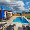 Der Gartenbereich ist eine Oase der Entspannung und Unterhaltung, mit einem Swimmingpool, einer weiteren überdachten Terrasse, einem Grillplatz und zwei überdachten Parkplätzen. Das Design des Hauses berücksichtigt Menschen mit Behinderungen, was es in der Region einzigartig macht.