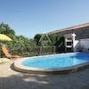 Auf einem 408 m² großen Grundstück bietet der sorgfältig angelegte Garten funktional aufgeteilte Bereiche, darunter einen erfrischenden 18 m² großen Swimmingpool, eine Grillzone, einen Maschinenraum und eine Außentoilette. Der Garten verfügt auch über eine 19 m² große Garage, die mit Wasser und Strom ausgestattet ist und als Taverne oder zusätzlicher Wohnraum dient. Das Anwesen bietet ausreichend Parkmöglichkeiten und eine üppig grüne Fläche, die eine perfekte Außenwohnumgebung schafft.