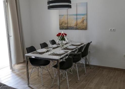 Erdgeschoss: Umfasst ein großes Apartment mit drei Schlafzimmern, zwei Badezimmern, einer Küche mit Esszimmer und einem Wohnzimmer. Direkter Zugang zur Terrasse und zum Garten vom Esszimmer aus bereichert das Wohnambiente.