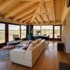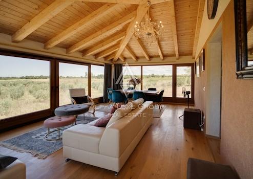 Der Wohnbereich ist von natürlichem Licht durchflutet, verstärkt durch große Glastüren, die einen Panoramablick auf den üppigen Garten bieten und zu einer eleganten überdachten Terrasse führen.