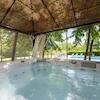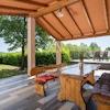 Der Außenbereich dieses Hauses ist durchdacht für Entspannung und Unterhaltung gestaltet. Es verfügt über ein großes angebautes Vordach, das sich in einen gepflasterten Poolbereich mit einem 34 m² großen beheizten Swimmingpool einfügt, was einen perfekten Außenwohnbereich schafft. Daneben bieten ein Loungebereich im natürlichen Schatten und ein Hydromassagebad unter einer Pergola ruhige Orte zur Entspannung, alles eingebettet in einen weitläufigen Garten mit üppiger mediterraner Flora, der ultimative Privatsphäre und Ruhe bietet.