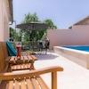 Kürzlich renoviert, umfasst die Residenz zwei gemütliche Schlafzimmer und ein Bad auf 70m² Wohnfläche. Ein zusätzliches Nebengebäude von 40m² dient als Hauptwohnbereich und verfügt über eine Küche, einen Wohn- und Essbereich, komplett mit Kamin und separatem WC. Der private Außenbereich bietet einen Swimmingpool und eine Entspannungszone, ideal für Freizeit und Genuss.