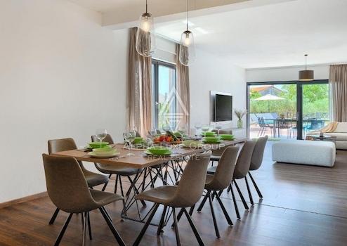 Die Villa verfügt über eine großzügige Wohnfläche von 272 m², verteilt auf zwei Ebenen, eingebettet in einen geräumigen Garten von 846 m². Das Erdgeschoss ist offen gestaltet und umfasst ein großes Wohnzimmer, eine voll ausgestattete Küche sowie einen Essbereich, der bequem zehn Gäste aufnehmen kann. Zusätzlich befindet sich auf dieser Ebene ein Schlafzimmer mit einem eigenen Badezimmer, das Privatsphäre und Komfort gewährleistet. Ein separates Gäste-WC ist ebenfalls auf dem Erdgeschoss gelegen.